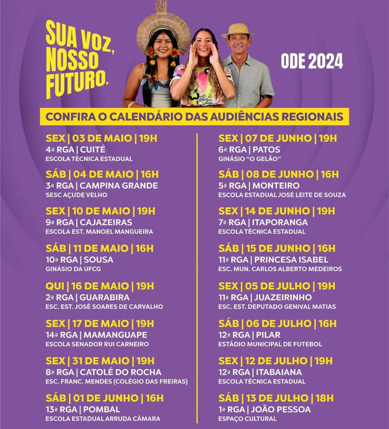 O calendário segue com audiências em Cajazeiras (10 de maio), Sousa (11 de maio), Guarabira (16 de maio), Mamanguape (17 de maio), Catolé do Rocha (31 de maio), Pombal (1 de junho), Patos (7 de junho), Monteiro (8 de junho), Itaporanga (14 de junho), Princesa Isabel (15 de junho), Juazeirinho (5 de julho), Pilar (6 de julho), Itabaiana (12 de julho) e João Pessoa (13 de julho).