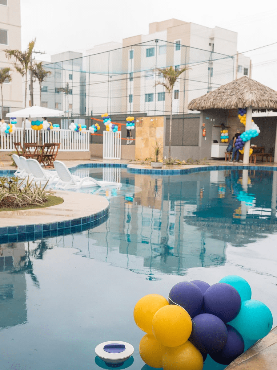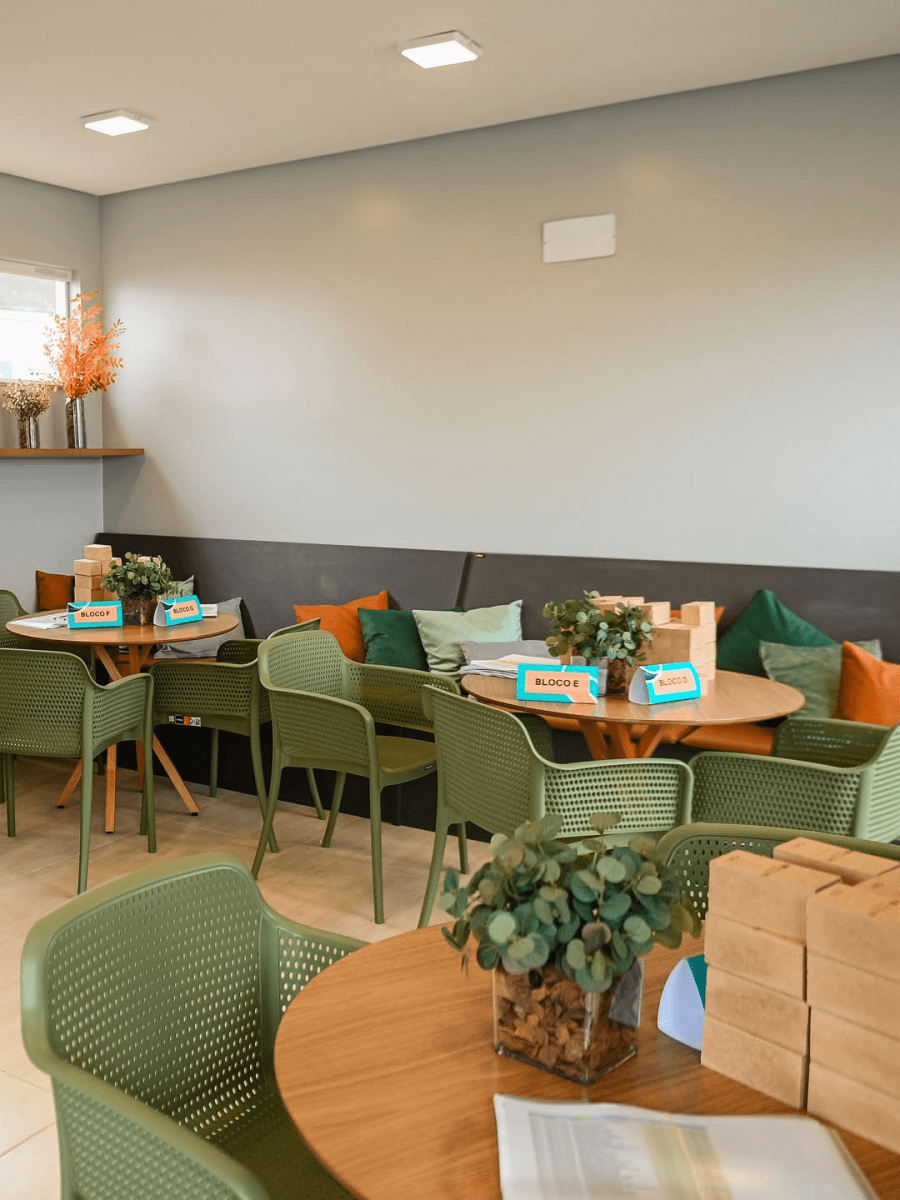 O condomínio ainda é composto por piscina adulto com raia, piscina infantil, prainha, área gourmet, três churrasqueiras, salão de festas, sala de reunião, coworking, brinquedoteca, playground, quadra de areia, bicicletário, pet care, espaço pet, academia, espaço funcional, espaço zen, lavanderia compartilhada, horta, pomar, guarita, eclusa delivery, mini market, além de energia solar fotovoltaica